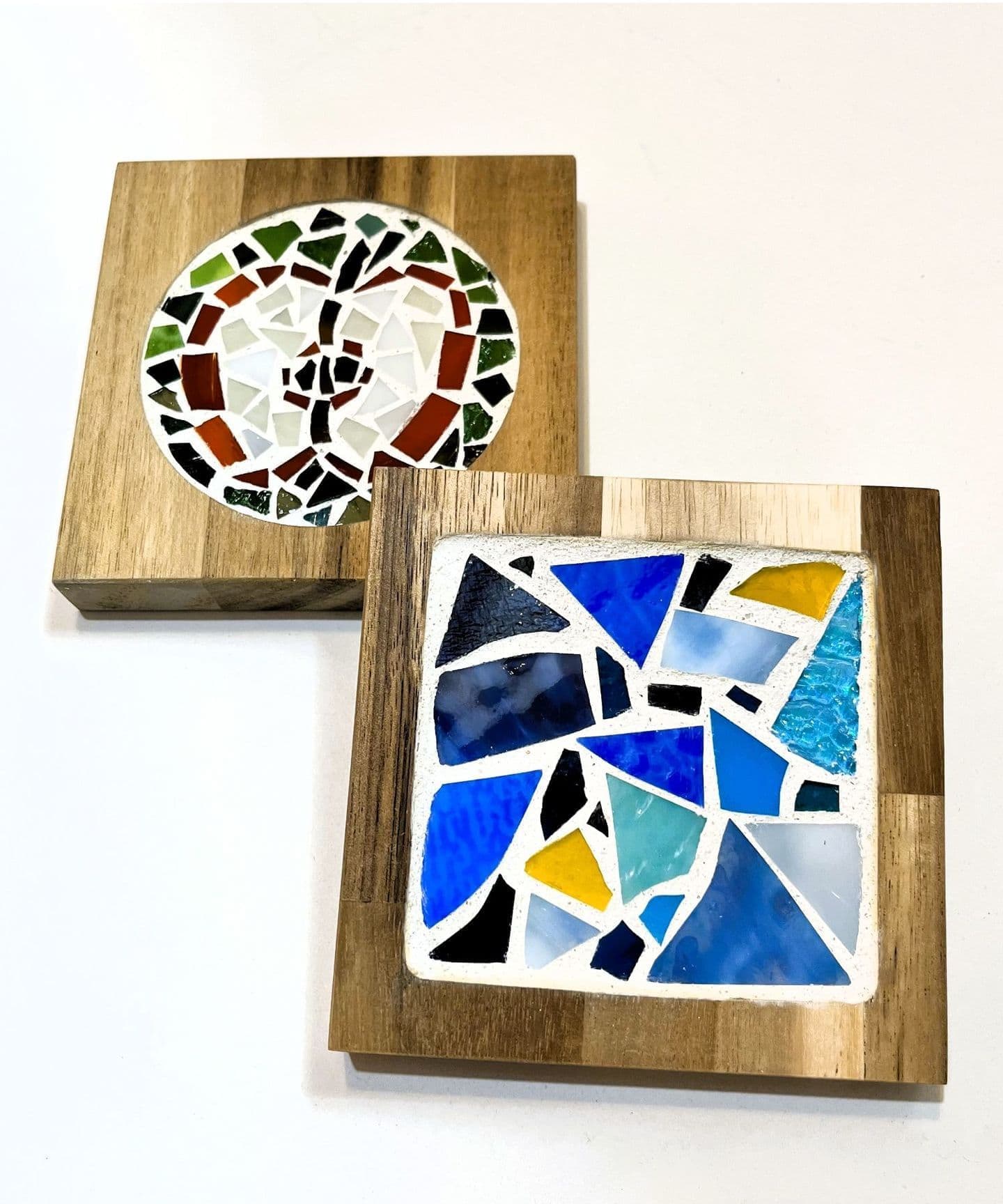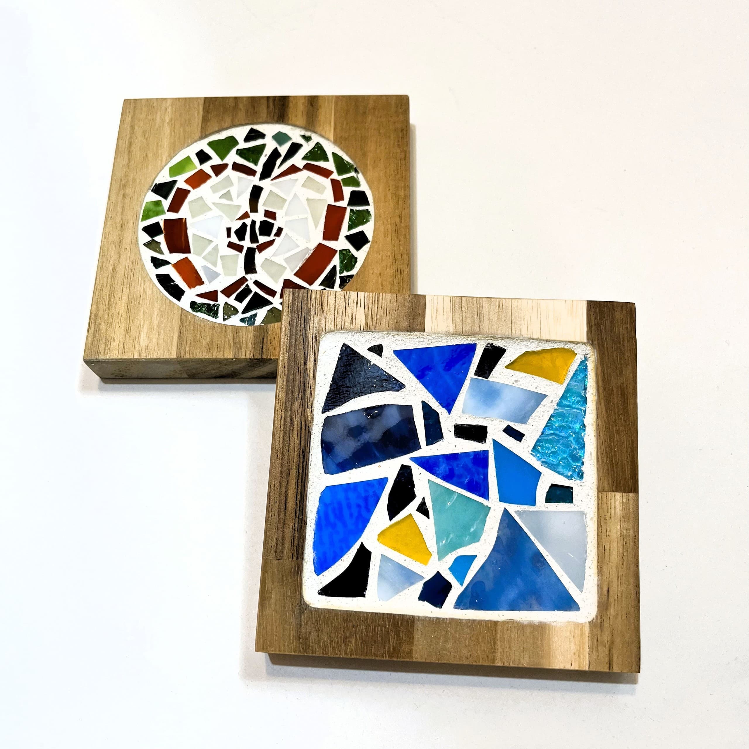木の土台にお好きな色や形のガラスを並べていただき、最後に目地を流し込みます。