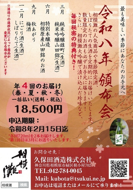 ※パンフレットには2/15までとしておりますが、仕込みの状況で発送が3月1週目になる為、 申込期限を月末まで延ばします。