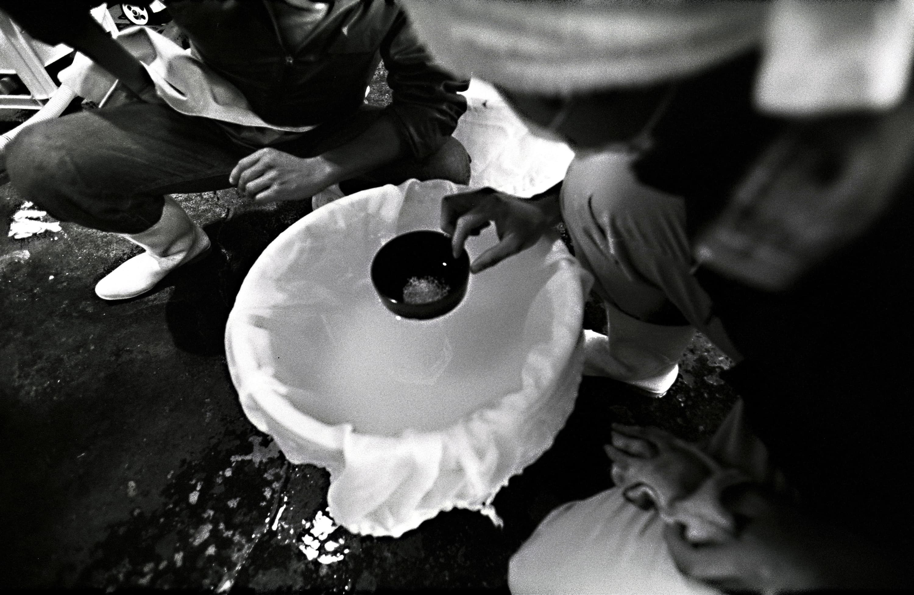 「洗米~浸漬~蒸米」と言う一連の工程を「原料処理」と呼びます。タンクにもろみを仕込む前の言わば下ごしらえの段階ですがその後の工程を大きく左右する非常に重要な工程です。日本酒の味とは「仕込み水に溶けた米の味」であると言っても過言ではありません。同じ原料米を使用しても原料処理の加減によってその溶け具合は大きく変わって来ます。つまり「最も美味しい溶け方をする理想的な蒸米」を造る事が原料処理の最大の目的であるとも言えます。原料処理は原料米の性質はもとより、洗米に使用する水の温度や浸漬時間によって影響を受ける非常に繊細な工程ですが、相模灘では「酒造りにおける最重要工程」と位置づけて全ての仕込みで大吟醸と同レベルの原料処理を行っています